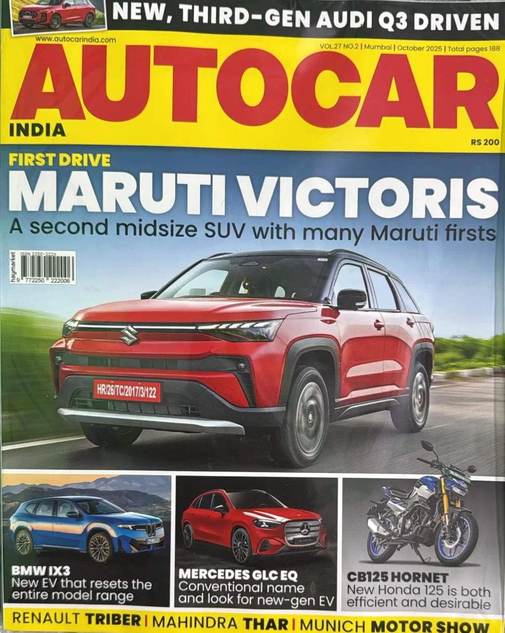 Autocar India magazine October 2025 – First Drive: Maruti Victoris offers an in-depth review of the latest Maruti Victoris, covering performance, design, features, and on-road experience. This edition is ideal for car enthusiasts, prospective buyers, and automotive industry followers looking for expert insights and analysis.
