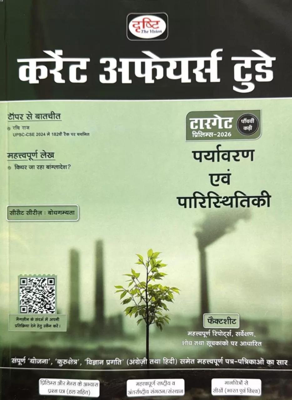 Drishti IAS Current Affairs Today Hindi – February 2026 (पर्यावरण एवं पारिस्थितिकी) पर्यावरण और पारिस्थितिकी से जुड़े महत्वपूर्ण समसामयिक विषयों का परीक्षा-उन्मुख विश्लेषण प्रस्तुत करता है। इस अंक में जलवायु परिवर्तन, जैव विविधता, पर्यावरणीय समझौते, संरक्षण पहल, पर्यावरण कानून, पारिस्थितिकी तंत्र और सतत विकास जैसे विषयों को सरल और तथ्यात्मक हिंदी भाषा में समझाया गया है। यह पत्रिका UPSC Prelims एवं Mains 2026, राज्य PCS तथा अन्य प्रतियोगी परीक्षाओं के लिए अत्यंत उपयोगी है।
